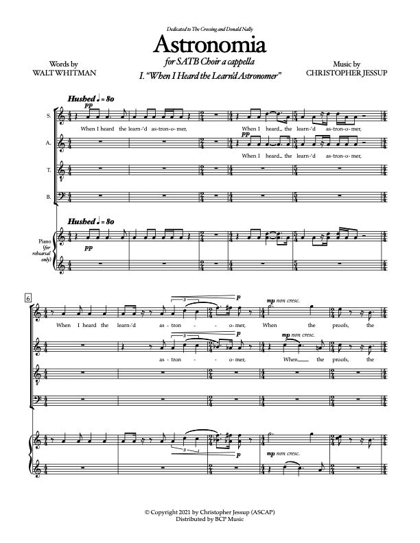 Astronomia is a set of three a cappella choral works, each of which use poems by Walt Whitman that center around the theme of astronomy. The first movement, “When I Heard the Learn’d Astronomer,” captures the moment when intellect gives way to intuition, and analytical observation yields to personal, lived experience. In the poem, the speaker listens to a scientific lecture on astronomy, filled with data and diagrams, but soon finds himself disengaged, longing instead for a direct encounter with the stars. Quietly slipping away, he looks up at the night sky in silence, finding a deeper, more spiritual connection with the cosmos. Set to music, this poem invites the choir to explore the contrast between the structured world of reason and the transcendent wonder of simply “looking up in perfect silence at the stars.” The piece is a journey from the noise of the mind to the stillness of the soul.